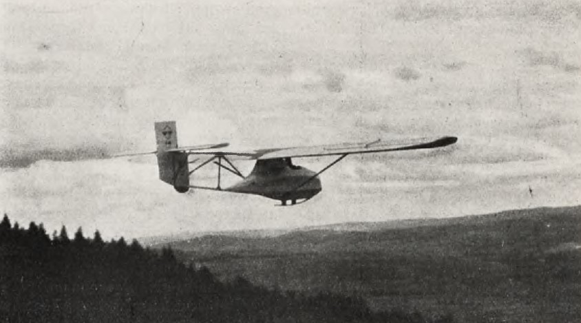 It was a high wing aircraft, with a single spar wing with rounded tips, straight taper on the outer ⅔ of the span and a constant chord centre section. The wings were ply covered from the leading edge to the main spar and fabric covered aft. The wings carried some dihedral and there was washout, a decrease in angle of incidence outwards along the span, on the outer panels to avoid spin initiation at the stall. Generous differential ailerons, also fabric covered, ran from the wingtips over most of the outer, tapered panels. The wing was mounted on a fuselage pedestal above and immediately behind the cockpit in the flat sided forward fuselage. Though open, this cockpit enclosed the pilot as in a light aircraft, rather than leaving him fully exposed as on many earlier primary gliders. A pair of lift struts joined the main spar to the lower fuselage longerons.
