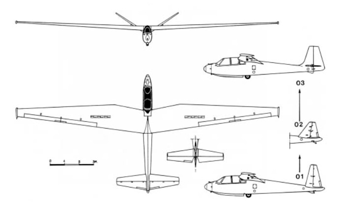 M-200 Span: 18.14m / 59 ft 6.5 in Length: 7.6 m / 24 ft 1.25 in Height: 6 ft 5 in Wing area: 17.46 sq.m / 188.4 sqft Aspect ratio: 19.0 Empty Weight: 345kg / 760lb Gross Weight: 570kg / 1255lb Payload: 225kg / 495lb Water ballast: None Wing Load: 32.65kg/sq.m / 6.7lb/sq.ft Max speed: 121 kt / 225 km/h / 140 mph (in smooth air) Max rough air speed: 81 kt / 150 km/h Stalling speed: 38 kt / 70 km/h MinSink: 0.64 m/s / 2.1 fps / 1.24 kt Best glide ratio / L/DMax: 32:1 at 98 kph/ 54 kt/ 61 mph No. of Seats: 2 Airfoil: NACA 63-619/15
