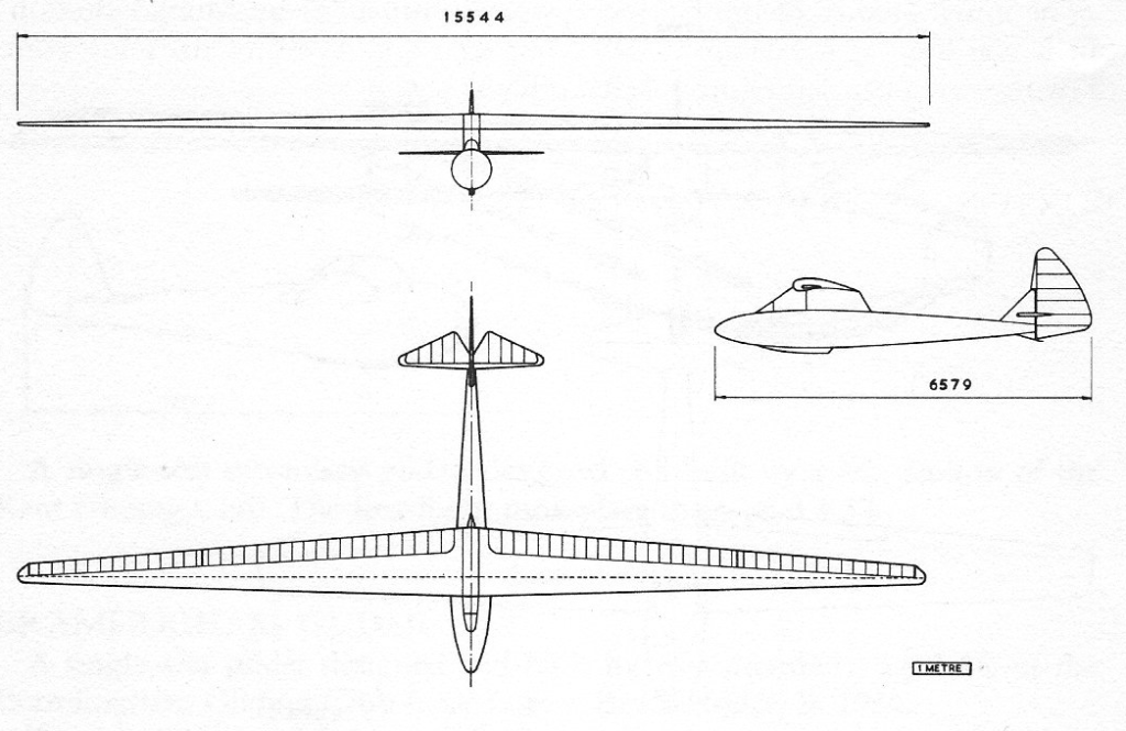 The sole example built was of conventional wooden construction, cantilever wing, with no air brakes or flaps. The undercarriage was main skid and tail skid.