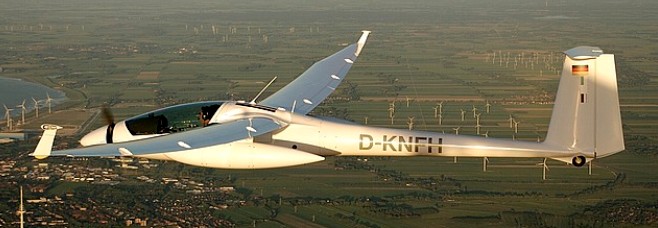The S 10 VT engine, a 115 horsepower Rotax 914 Turbo (thus the “T” in the designation) with water cooled heads and a dual ignition system, is located in the lower fuselage be¬hind the cockpit. A centrifugal clutch turns a carbon fibre driveshaft, which is encased in a Kevlar tunnel and runs through the cen¬tral console to a reduction gearbox (0.9: 1) mounted behind the propeller in the nose section. The variable pitch (the “V” in the designation) folding propeller blades extend au¬tomatically by centrifugal force when the engine is started, with the nose cone mov¬ing forward and out of the way. When the engine is stopped, the blades fold inwards by a spring system and the nose cone is re¬tracted (which takes about six seconds) and the machine becomes a glider. The two-seater has carbon-fiber wings and solar panels for 30W of electrical power once airborne.