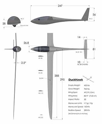 The DuckHawk is a development of the Windward Performance SparrowHawk and is intended as a higher performance glider than its predecessor, with very high structural limits and Vne. The DuckHawk has less than 10% parts commonality with the SparrowHawk. It features a cantilever wing, a single-seat enclosed cockpit under a bubble canopy and retractable monowheel gear.