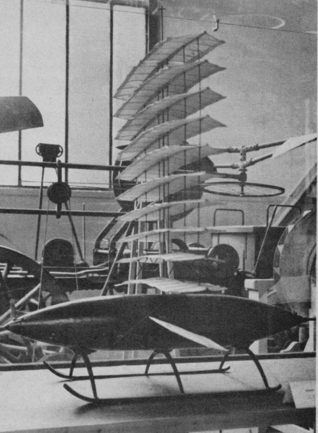 The 1873 Renard Decaplan 10-wing glider had twin skid gear and an aileron at the centre point on each side of the fuselage.