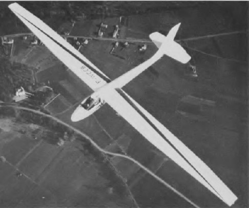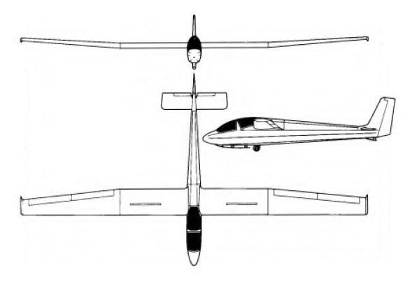 The Bijave is of conventional mixed construction very similar structurally to the Javelot; the cantilever wooden shoulder wings are in three pieces, with 4° 30′ dihedral on the outer wings and none on the centre section. They have single box spars and D type leading edge torsion boxes, with birch plywood covering forward of the spar and fabric covering aft of it; the plain spruce ailerons are also fabric covered. There are no flaps, but perforated Schempp-Hirth wooden air brakes retract into slots above and below each wing; wing tip ‘salmon’ fairings are also fitted. The fuselage is a welded steel tube framework covered with fabric, and with a glassfirbe nose cone. The two pilots sit in tandem under individual blown Plexiglas canopies, the rear seat being raised a bit to give its occupant a good view forward; a full range of instrumentation, a compass, oxygen and radio can be carried. There is a retractable monowheel with rubber ring shock absorption and a SATMO motor-cycle brake mounted aft of a rubber-sprung wooden nose skid, and there is also a steel tailskid. The cantilever wooden tail unit has a fabric-covered rudder, and the all-moving one-piece tailplane has large antibalance tabs.