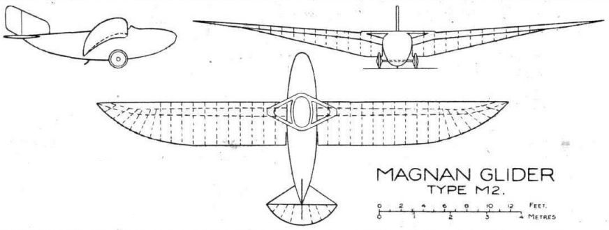 Basing his design to some extent upon birds, in 1921 Dr. Magnan produced a cantilever monoplane, the wing of which is of uniform chord over approximately one-half of its span, but tapering to a point at the tips. The leading edge is straight and the taper is provided solely by the trailing edge. Near the root the wing is swept down suddenly and sharply to form a pronounced dihedral angle. This angle extends over but a few feet of the span, and the rest of the wing is at a smaller dihedral. The wing tapers in thickness as well as in chord, and the angle of incidence is progressively altered, being around 20 degrees at the root. In addition to the change in section and angle, the wing ribs are so constructed that they are capable of being flexed to an extent under varying loads. No ailerons are fitted. Lateral control is by wing warping.