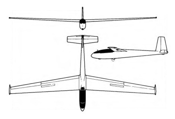Wingspan: 59.055 ft / 18.0 m Wing area: 172.224 sq.ft / 15.95 sq.m Aspect ratio: 20.3 Wing Profile: NACA 653-618 (root), 631-612 (end) Length: 26.575 ft / 8.1 m Weight empty: 295 kg Max take-off weight: 480 kg Wing load: 30,02 kg/sq.m Glide ratio: 38.0 at 81km / h Min sink: 0.59 m/s at 76 km / h Crew: 1