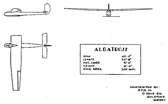 The RFD Company constructed the Albatross to C.H. Latimer-Needham’s design, the first British-designed and built sailplane. It was a conventional wooden single-seat aircraft, its cantilever high wing having a constant chord centre section and outboard straight-tapered panels from about mid-span. Ailerons were fitted from the wing tips over most of the outboard sections but here were no flaps or air brakes. The wing was mounted with slight dihedral on top of the fuselage, which was rectangular in cross section and tapered only a little towards the tail. There were no fixed rear surfaces, both elevators and rudder being all moving. The elevator, mounted on top of the fuselage, had constant chord apart from a cut-out for rudder movement; the latter was tall, with a vertical leading edge and curved trailing edge.