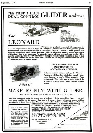 Billed as the first two seat glider to enter production, the 1930 Leonard Motorless Aircraft Company glider of 1930 was designed by graduate aeronautical engineers to meet the requirements of the US Dept of Conmmerce.