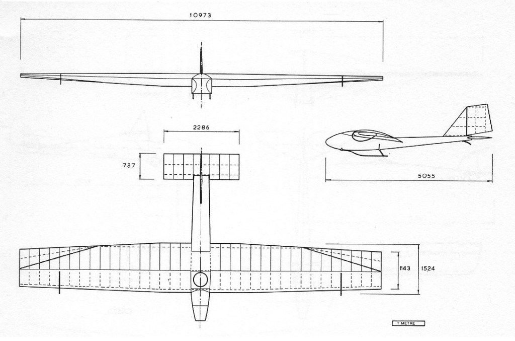 Thirty of these tandem two-seat primary training gliders have been built by 1961, since August 1953, when the prototype made its first flight. Construction is conventional, with a fabric-covered steel-tube fuselage nacelle and fabric-covered two-spar braced wooden wing.