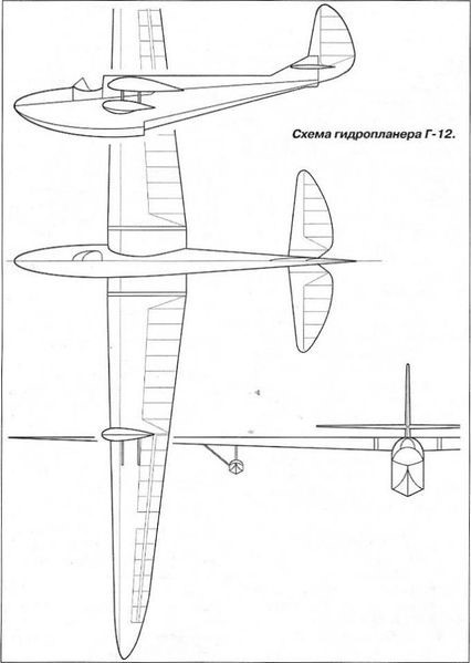 The G-12 glider was designed as a single-seater hydrofoil with a single-beam hull and high cantilever wing that had stabilization floats fixed to a support and braced by means of uprights on its external side. The wing structure comprised two box-like spars, joined together by light ribs. The wing was covered with 1 – 1.5 mm thick plywood, creating a flexible but strong structure. The wing had a fabric covering.