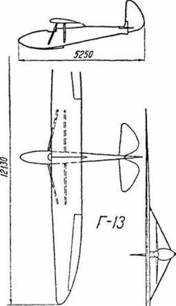 G-13 Wingspan: 12.1 m Wing area: 12.8 m² Length: 5.37 m Height: 1.42 m Empty weight: 86 kg Elevator area: 1.50 m² Rudder surface area: 0.8 Ailerons area: 1.72 Wing loading: 12.9 kg / m² Glide ratio: 17 Accommodation: 1
