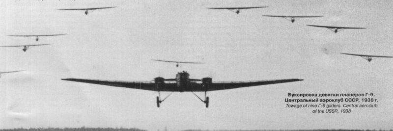 In 1938, a glider train made up of nine G-9 gliders towed from a Túpolev TB-1 bomber was presented during the air festival over Túshino A year later this story would repeat itself, but in this case with nine gliders.