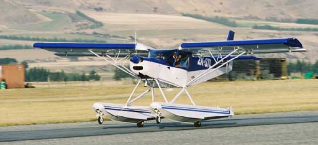 Amphibious floats cut the speed by 3 mph. The floats are built in about 80 hrs from plans and are installed without removing the tri gear. The nose wheel folds back.