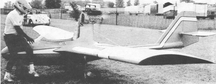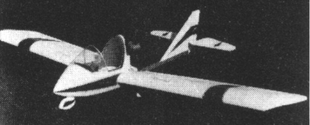 Single seat single engined mid wing mono¬plane with conventional three axis control. Wing has swept back leading and trailing edges, and tapering chord; cruciform tail. Pitch control by fully flying tail; yaw control by fin mounted rudder; control inputs through stick for pitch/roll and pedals for yaw. Wing braced from above by cables; wing profile Karman; 100% double¬ surface. Undercarriage has three wheels in tricycle formation. Push right go right nosewheel steering connected to yaw control. Aluminium tube/glass¬fibre fuselage, partially enclosed. Engine mounted above wing driving pusher propeller.