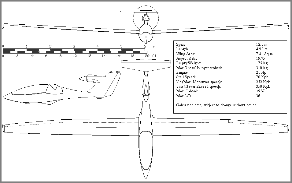 The span is 39′ 8″ and best L/D is 38:1. They also offered a fast build kit version for $5l,890 that saves approximately 300 hours from the normal 1000 hour build time. The glider is stressed for aerobatics and has enough fuel capacity and a variable pitch propeller for efficient powered cruising up to 3 hours. The Windex uses preimpregnated composite materials and an autoclave cure process for high strength to weight ratio in the structures. No other current sailplane uses this fairly expensive process. The prize of the kit was US$39,000 in 1997. Windex also offered a building assistance program in Sarasota, Florida for $870 per month and will provide qualified helpers for $40 per hour.