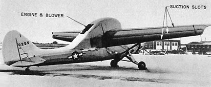Modifications consisted essentially of a new plywood wing that contained full-span, double-segment flaps together with full-span suction slots and ducts, plus addition of a suction blower in the fuselage driven by an auxiliary 80hp Franklin O-180-1.