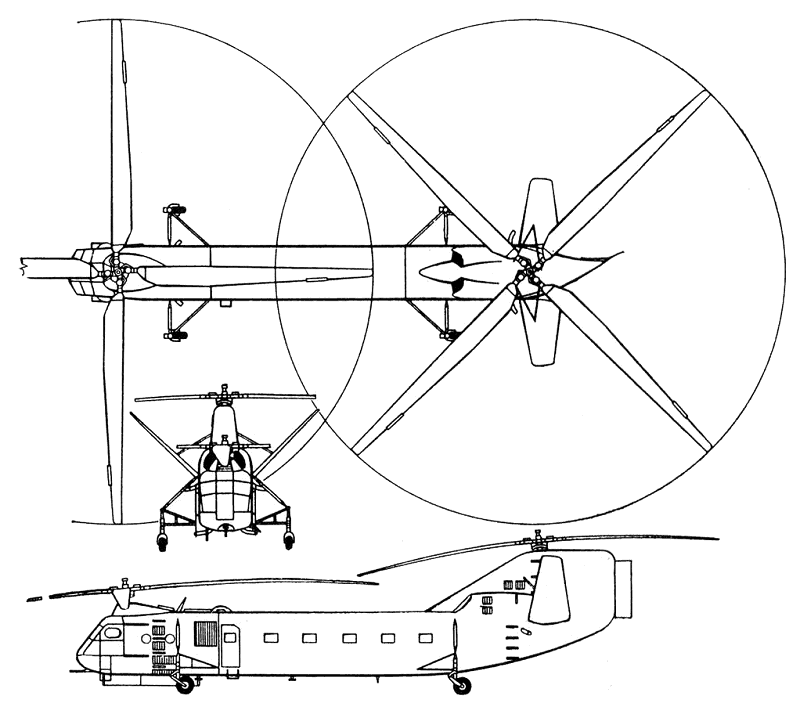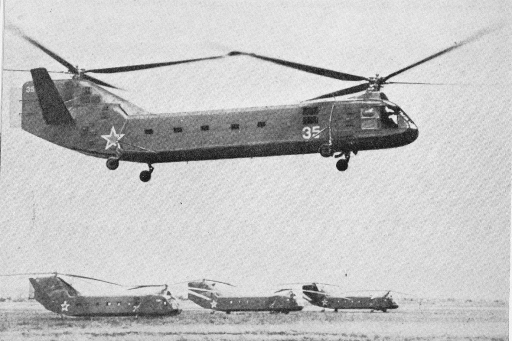 A S Yakolev has described how, in autumn 1951, he and other designers were called to the Kremlin and told by Stalin to create two helicopters, one to carry a useful load of 1,200kg or twelve armed infantry and the other just twice as much, prototypes to be ready in one year. It was to be a ‘crash programme’, with ‘unlimited support’ from the national research institutes. Nobody was eager, but eventually Mikhail L Mil agreed to tackle the smaller machine and Yakolev the larger, Yakolev having the idea of simply using tandem rotors based on those of the Mil’ design.