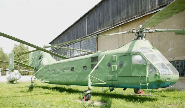 Production was ordered at a Leningrad factory, where thirty-five were built for the VVS in 1956-58. These were painted in dark green camouflage, and except for the first few had larger tailplanes with dihedral reduced to 20deg carrying large endplate fins set at an angle of 3deg 30′ to give the required thrust to the left in cruising flight, the tail end no longer being curved to the right. They had full equipment for loading and securing vehicles and other cargo up to a maximum of 3,000kg. Canvas wall seats were provided for twenty troops, with racks for weapons and equipment, with pillar sockets for eighteen stretchers accompanied by an attendant. A three-tonne load could also be slung from a central hook, but on 17 December 1955 Milyutichev carried an overload of four tonnes to 2,092m. On the same day G A Tinyakov set a second world record in the same prototype by taking 2,000kg to 5,032m.