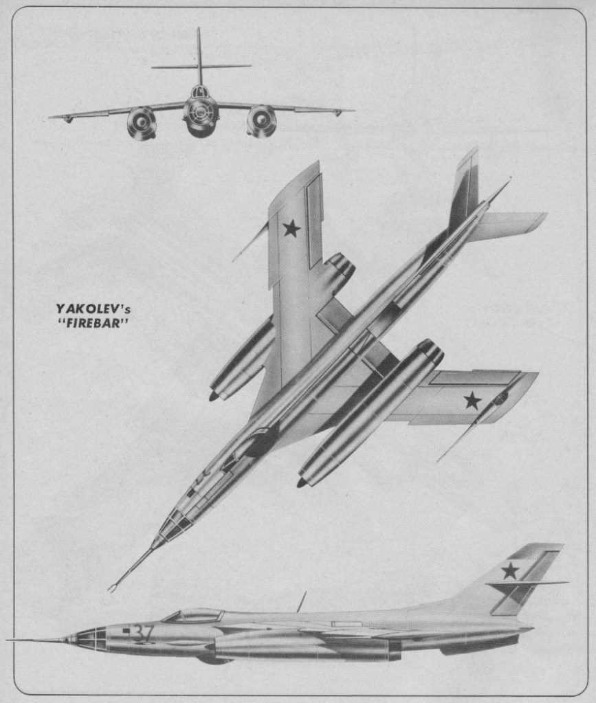A light bomber and reconnaissance aircraft (NATO code name ‘Brewer’), and all weather fighter (NATO code name ‘Firebar’) and trainer (NATO code name ‘Maestro’). The Yakolev Yak-28P Firebar was a two-seater transonic all-weather twin-jet interceptor with a maximum speed of Mach 1.1 at 35,000 feet and a service ceiling of 55,000 feet. The Yak-28 first flew on 5 March 1958.