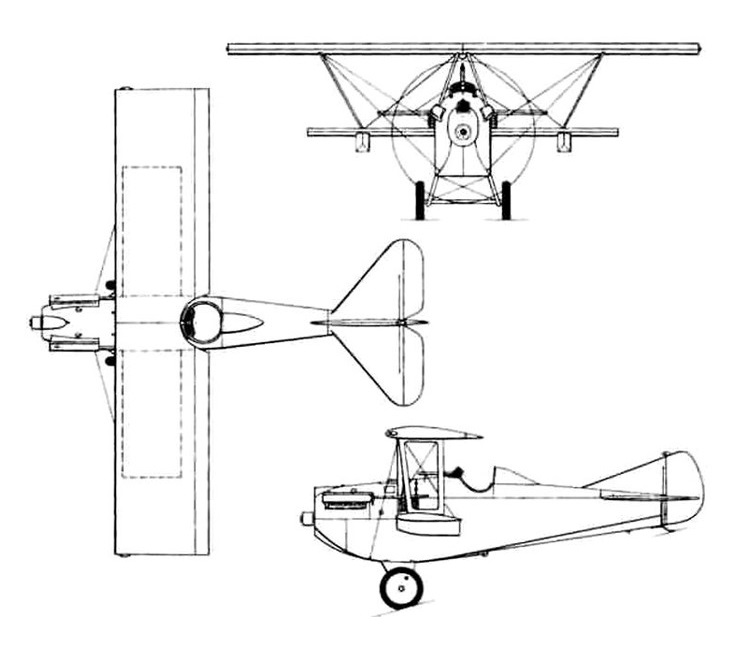 Centre section bracing consisted of two welded steel tube assemblies instead of individual struts; outer wing struts were wood. Landing gear struts were streamlined steel tubing cross-braced with wire. The axle, secured to the landing gear struts with rubber shock cord, was carried inside a streamlined spreader bar fairing hinged at its top to allow upward movement of the axle when under load. The lower wing was not attached to the bottom of the fuselage but mounted on a narrow external keel that projected below the fuselage proper. The rear landing gear struts also attached to this keel where it joined the rear wing spars.