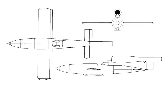Fi 103R-IV Powerplant: one 350 kg (772 1b) thrust Argus 109 014 pulsejet. Max powered level speed 650 kph (404 mph) at sea level Endurance (limited by pulsejet life) 20 min. Weight: at launch 2180 kg (4,806 lb). Wing span: 5.715 m (18 ft 9 in) Length 8.00 m (26 ft 3 in) Height: 1.42 m / 4 ft 8 in Maximum fuselage diameter 0.838 m (2 ft 9 in) Warhead: 850 kg (1,874 lb).