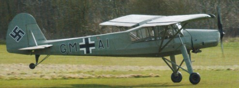 In the summer of 1935, Fiesler Chairman Gerhard Fieseler, Chief Designer Reinhold Mewes and Technical Director Erich Bachem designed a practical STOL aircraft, the Fieseler Fi 156. It was seen as fulfilling numerous roles both in civil life and for the recently resurgent Luftwaffe. The Fieseler Fi 156 Storch (Stork) was a STOL (short take-off and landing) aircraft, a three-seat extensively glazed cabin, high-winged machine with the wing liberally endowed with slats and flaps and a stalky landing gear arrangement, well suited to cushioning arrivals at unprecedentedly steep angles. The high-lift devices allowed a take¬off run of only about 60 m (200 ft) and it could land in about one-third of that distance. Fieseler’s chief designer, Reinhold Mewes, decided for ease of maintenance that the airplane should be completely conventional in its construction, and so utilized a steel tubing and fabric fuselage with wooden wings with a conventional braced tail unit and fixed tailskid landing gear. The wings were made of wood simply because they could be made in low grade factories using forced labour. The original wooden wings contained only 2 x 74 lt tanks. The engine was the then-common Argus As 10C inverted V-8 aircooled 240-hp model.