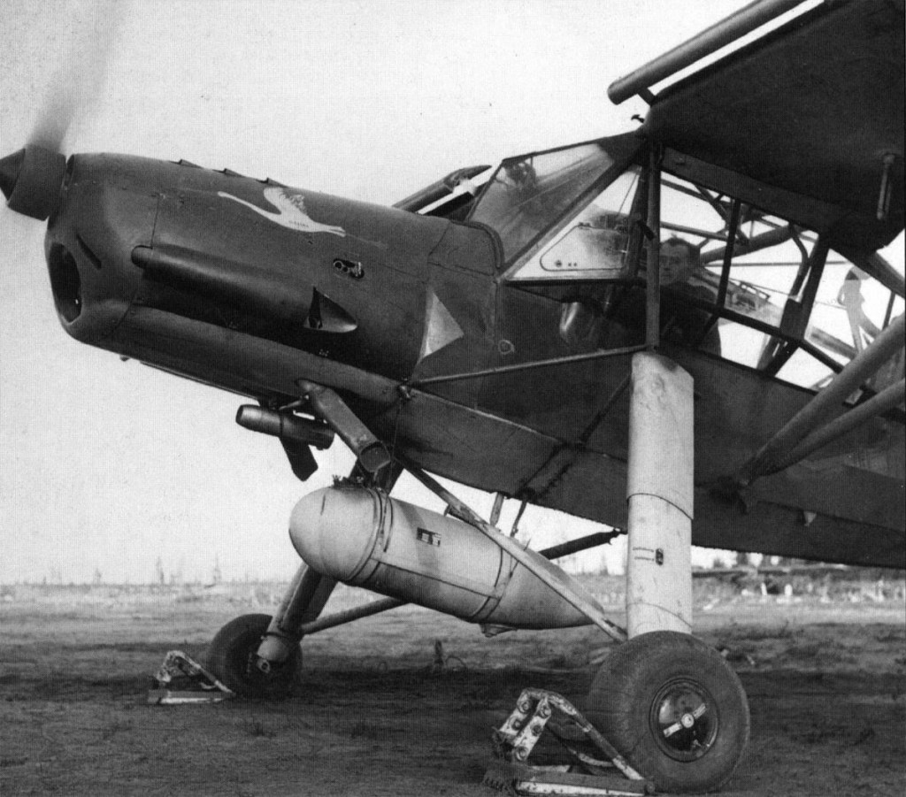 Tests against fighters appeared to confirm that, at around 34 mph (55 km/h), it was a very difficult target for fighters. There was almost trouble when Udet’s camera-gun film showed not one picture of the elusive Storch. Another Fi 156A-0 was tested with three SC-50 (50 kg/110 lbs) bombs, with aim marks painted on the Plexiglas windows, while another did successful trials against a U-boat with inert 298 lbs (135 kg) depth charges. Less unexpected were supply-dropping tests and trials with smoke apparatus.
