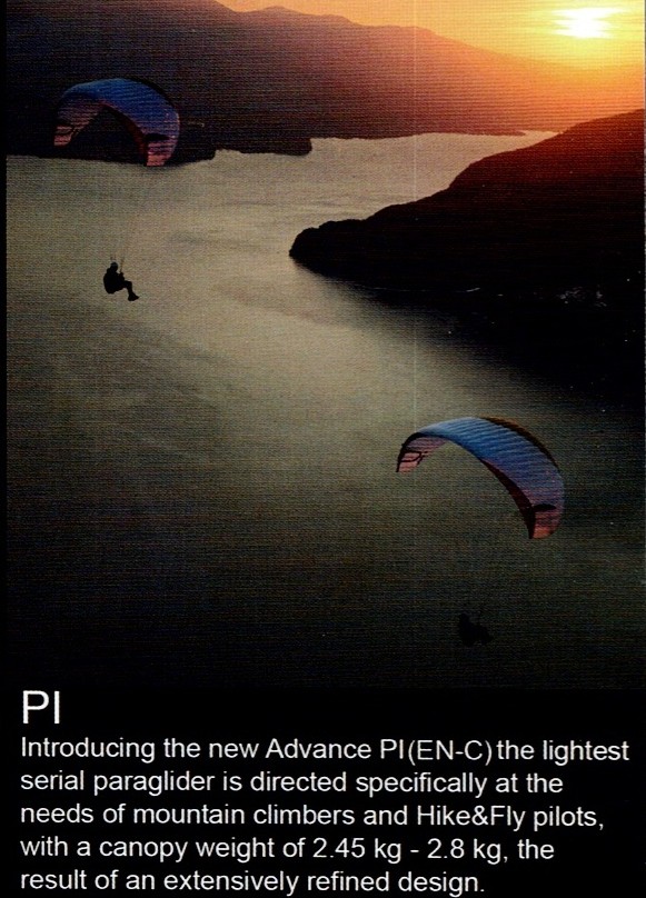 Top XL Paraglider circa 1998. Wing area: 32 sq.m Certification: Afnor Pilot weight: 85-125 kg No. of cells: 68 Wing span: 14.1 m Aspect ratio: 6.2 Min sink: 0.9 m/s Max speed: 57 kph Price (1998) 4990 SF
