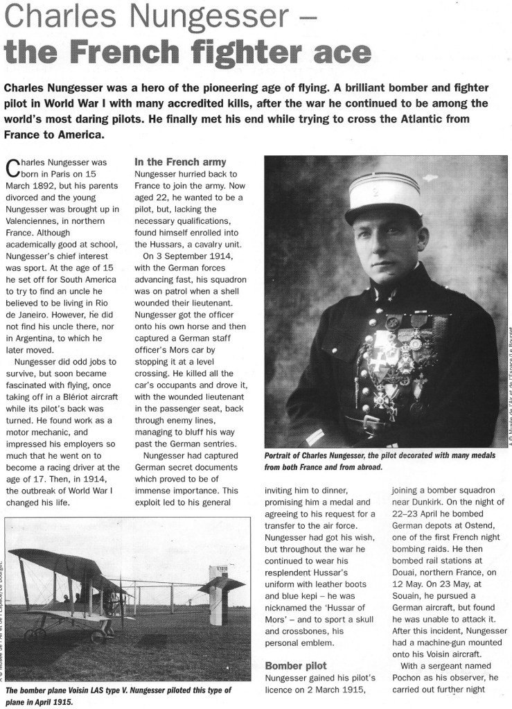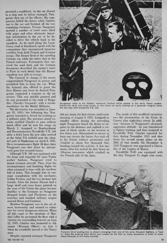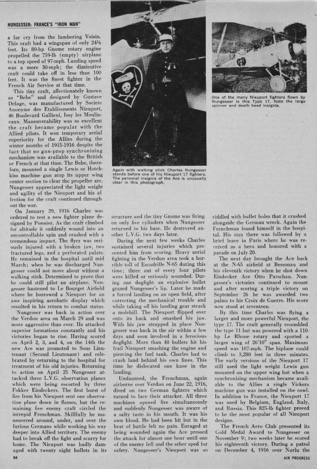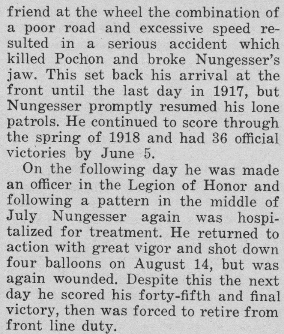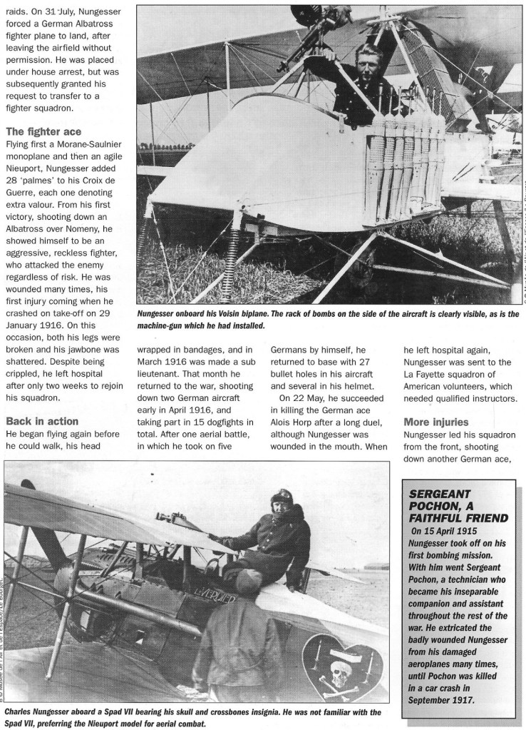 Something of a pre-war playboy with a name as a racing driver in South America and a self-taught pilot, he first fought as a hussar in France during 1914 before transferring to the air service. He suffered frequent wounds (17 times) in combat, necessitating repeated returns to hospital to have fractured bones rebroken and reset yet, flying Nieuports with Escadrille N65 from November 1915 onwards, he amassed a victory total of 45, often being unable to walk and having to be carried to his aircraft. Nungesser survived the war as a darling of Parisian society, only to disappear during an attempt to fly the Atlantic in May 1927. His aircraft insignia in war and peace comprised a black heart charged with a skull and crossbones, two candles and a coffin.