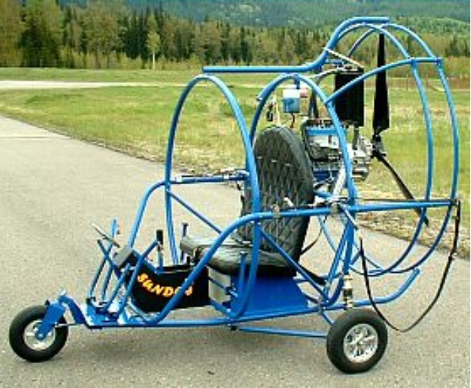 Engine: Rotax 503, 52 hp B box, recoil start Prop: Powerfin or GSC Length: 101 in Width: 76 in Height: 84 in Parachute: Apco 500 Empty weight: 302 lb Maximum Payload: 377 lbs Air speed: 28 to 33 mph Takeoff Distance: 60 – 200 ft Landing Distance: 30 – 100 ft Glide Ratio: 4 – 5 to 1 Rate Of Climb: 300 – 800 ft/min. Sink Rate: 500 – 700 ft/min Fuel Tank: 5 or 10 UGS