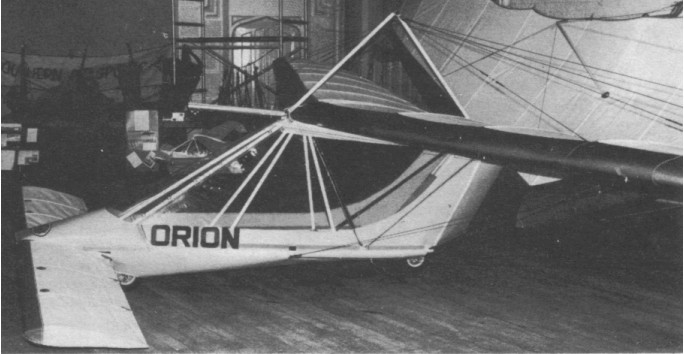 As first shown at the British Hang Gliding Association’s annual general meeting in March 1983, the Orion is a fully enclosed hang glider/sailplane with pitch control by weight shift moving a fully flying canard. Combined roll and yaw control is provided by tip rudders mounted under the ends of the wing and with their pivots angled at 45O to the vertical, so that they provide roll at the same time as yaw. Both may be deployed simul¬taneously, to provide air braking.